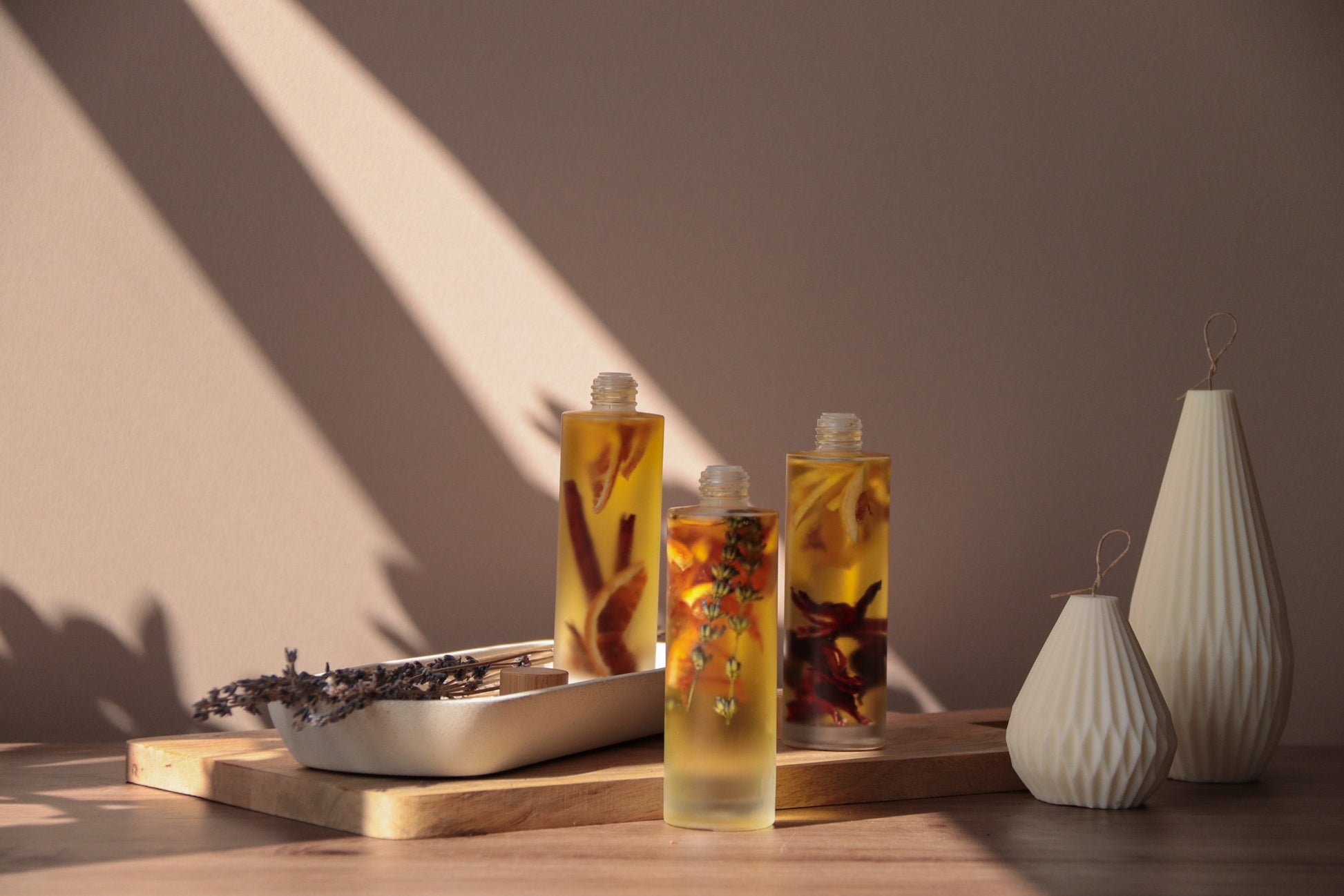 Jojoba Oil, Grapeseed Oil, Sweet Almond Oil, Vitamin E Oil, Essential Oils: Rose, Clary Sage, Lemongrass, Jasmine, Frankincense, Dried Fruits and Flower: Hibiscus, Lemon Slices